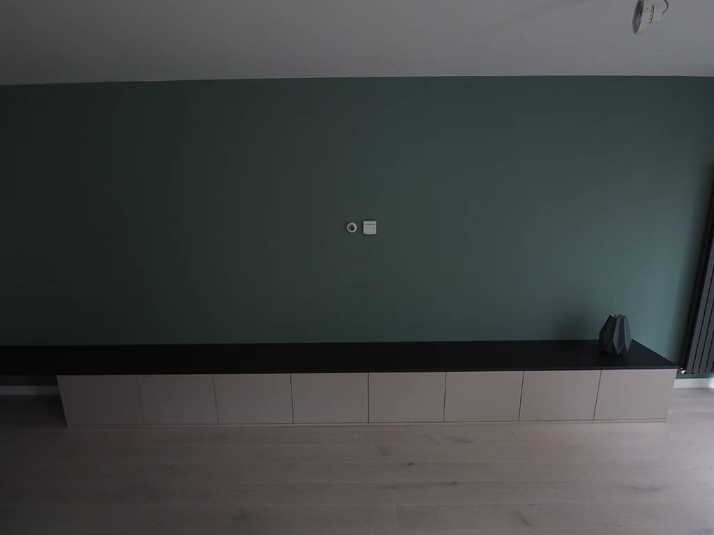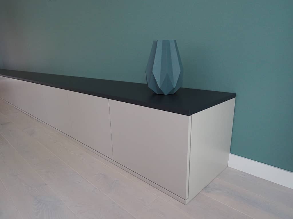 Een dressoir dat doorloopt in een bank. Gemaakt van berken multiplex en gelakt in een grijze kleur.